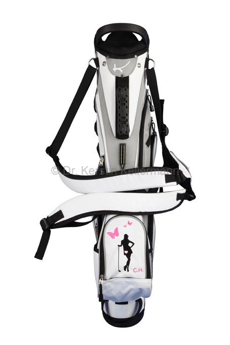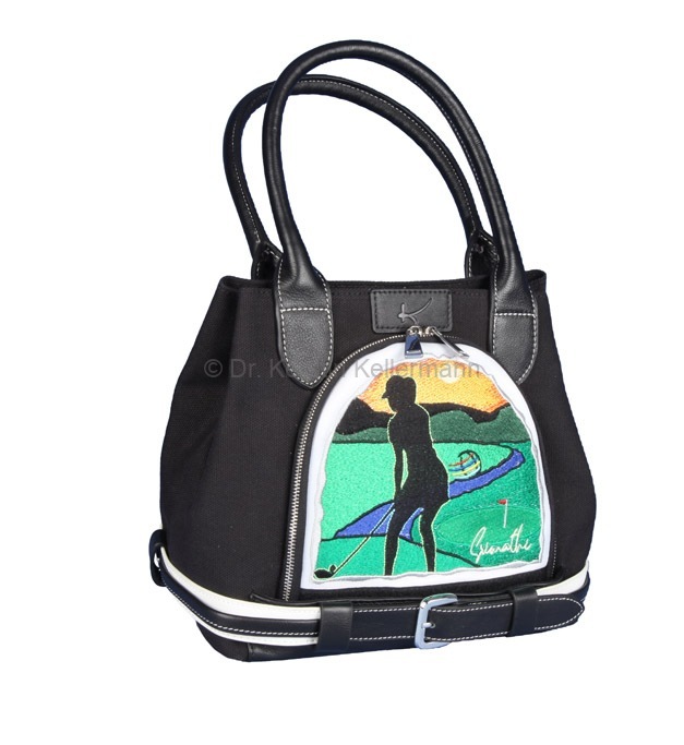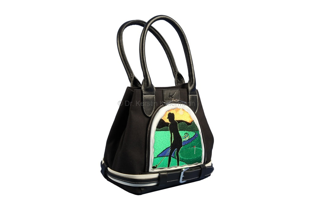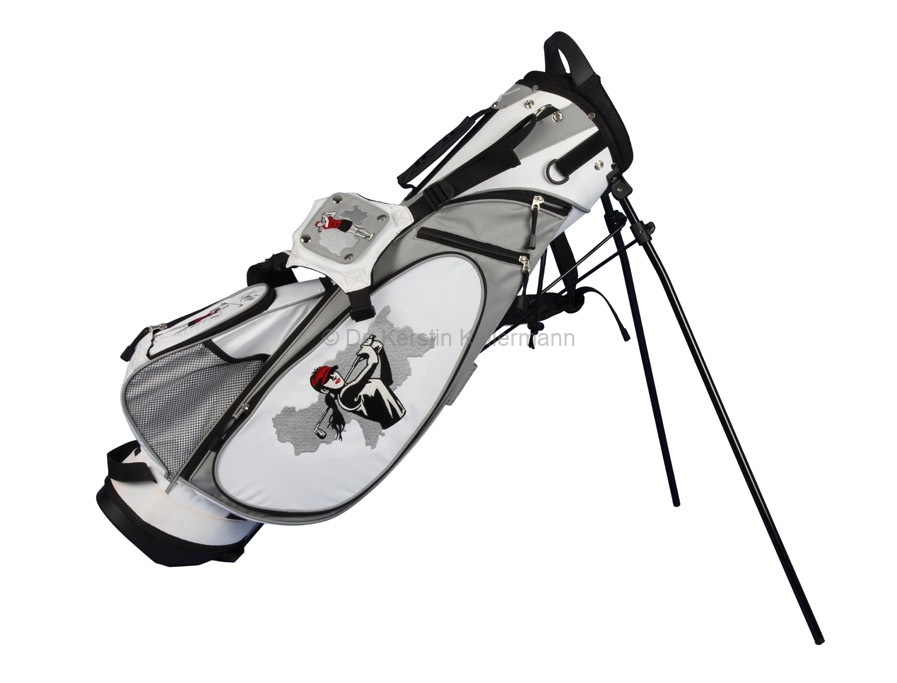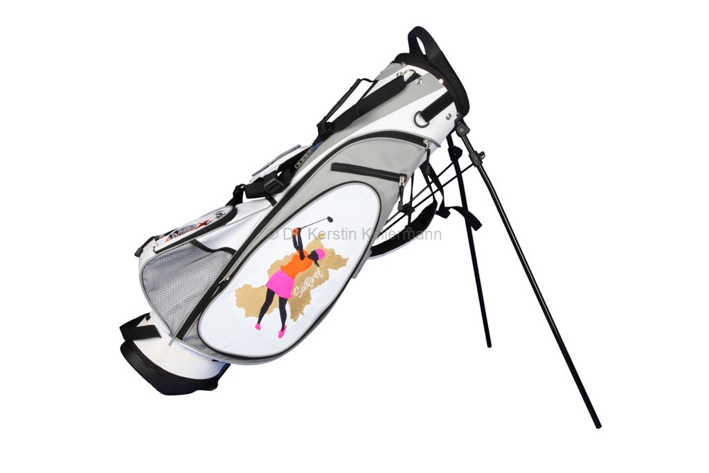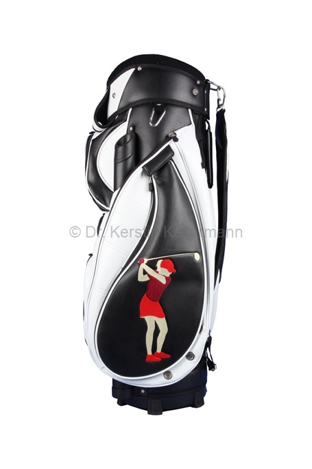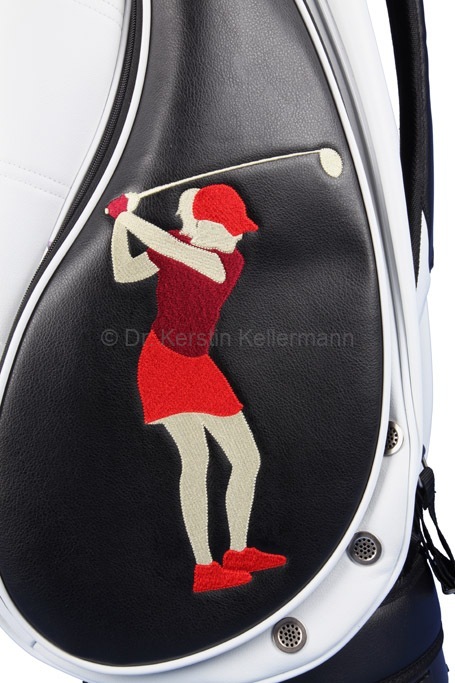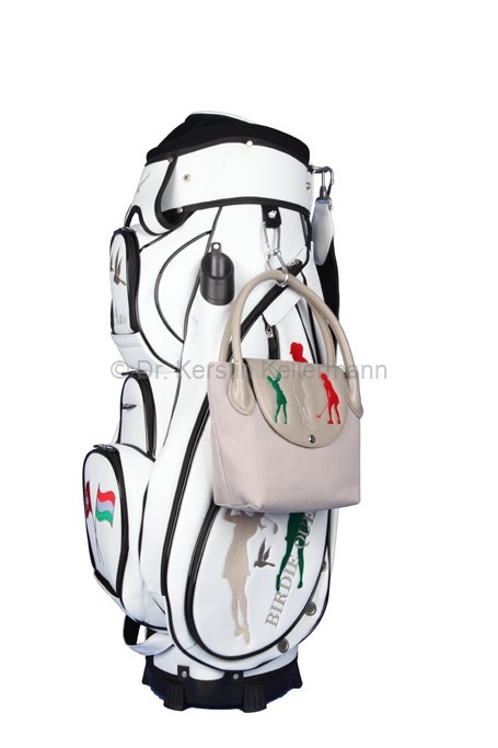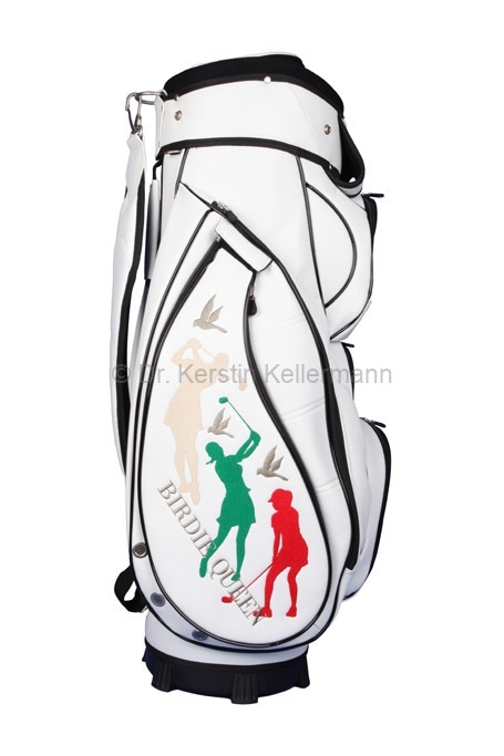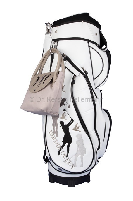 Das Design „Birdie Queen“ ist eine Kreation aus dem Jahr 2017. Damals bot ich erstmals ein Cartbag zusammen mit einer Golfhandtasche in einem festgelegten Design an. Bei diesem Angebotspaket mußte der Kunde nicht selbst kreativ werden. „Birdie Queen“ entstand darauf hin, in unterschiedlichen Farbvariationen. Bei diesem Design präsentiert sich eine Golferin am Abschlag in verschiedenen Positionen. „Birdie Queen“ ging in dunkelblau, weinrot und beige an den Start. Später entstanden aber auch auch Cartbags mit passenden Handtaschen in turkis, grün, rot, rosa, grau und schwarz. Das besondere Angebot ist auch heute noch sehr beliebt und wird zusammen mit dem Cartbag GENEVE gefertigt.